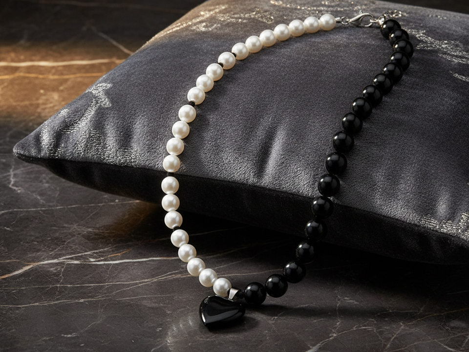 Šis rankų darbo kaklo papuošalas, Nakties širdis, įkūnija dvi priešingybes, susiliejančias į vientisą elegancijos melodiją. Baltos perlų karoliukų gijos simbolizuoja tyrumą, šviesą ir ramybę, o juodi onikso akmenukai – paslaptį, stiprybę ir gilumą. Centre esanti širdies formos agato akmens pakabuko detalė suteikia papuošalui romantišką akcentą, tarsi primindama, kad šviesa ir tamsa visada šoka kartu. Ilgis 42 cm plius 6 cm prailginimas.