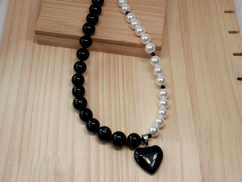 Šis rankų darbo kaklo papuošalas įkūnija dvi priešingybes, susiliejančias į vientisą elegancijos melodiją. Baltos perlų karoliukų gijos simbolizuoja tyrumą, šviesą ir ramybę, o juodi onikso akmenukai – paslaptį, stiprybę ir gilumą. Centre esanti širdies formos agato akmens pakabuko detalė suteikia papuošalui romantišką akcentą, tarsi primindama, kad šviesa ir tamsa visada šoka kartu. Ilgis 42 cm plius 6 cm prailginimas.